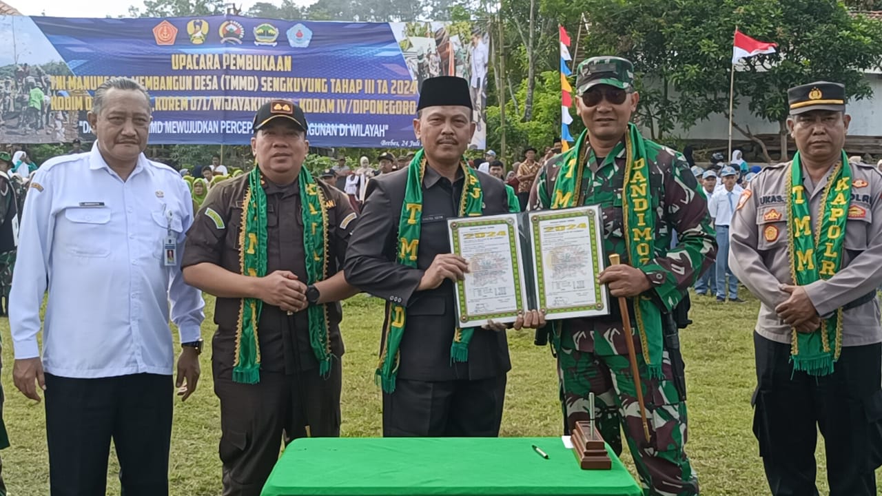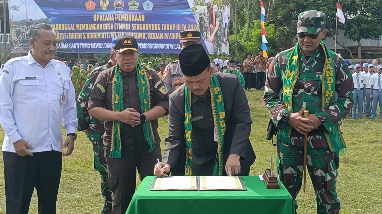 Brebes – Pembukaan Tentara Manunggal Membangun Desa (TMMD) Sengkuyung Tahap III Tahun Anggaran 2024 berlangsung di lapangan Dukuh Wanasri, Desa Waru, Kecamatan Bantarkawung, Brebes, Jawa Tengah. Rabu (24/07/2024).
