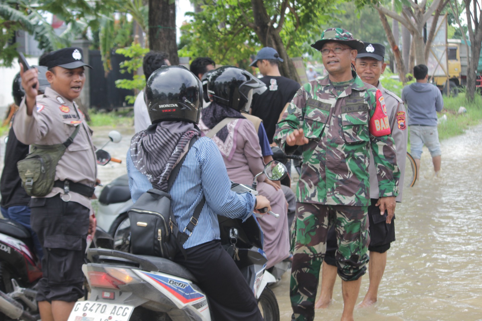 Sejumlah anggota Koramil 01/Brebes dan Polsek Brebes bersiaga dan melakukan evakuasi terhadap warga yang akan meninggalkan lokasi dan membantu warga yang akan melaksanakan aktivitas.