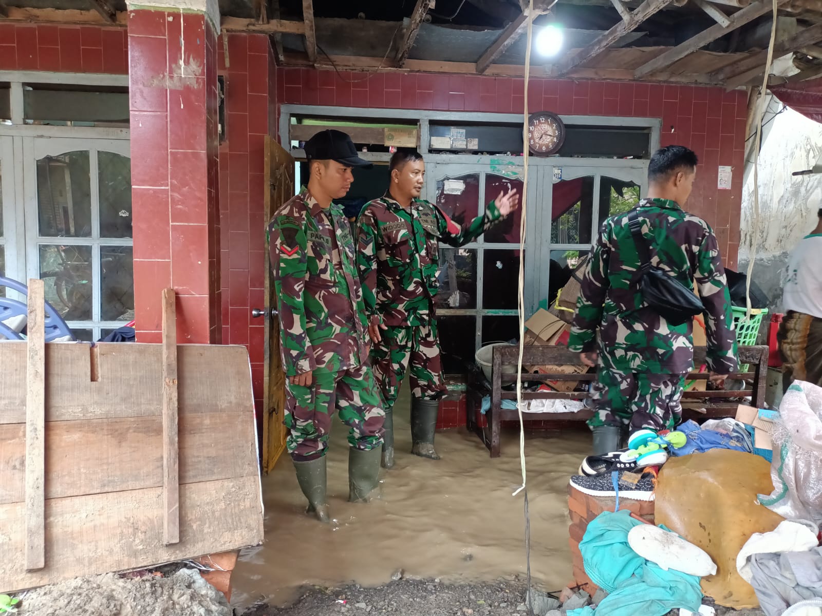 Babinsa dari Koramil 15/Ketanggungan Kodim 0713/Brebes Korem 071/Wijayakusuma Peltu Watimin beserta anggota dan warga terjun langsung kerumah rumah yang terdampak untuk membantu membersihkan rumah warga dan ruas jalan dari lumpur dan sampah.