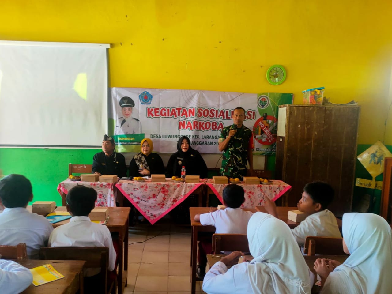 Brebes – Babinsa Koramil 16/Larangan, Kodim 0713/Brebes, Serka Junaedi bersama Camat Larangan Ebi Listiana, S.I.P., Kapolsek Larangan AKP Muhammad Yusuf dan Tim Kecamatan Larangan memberikan sosialisasi tentang bahaya penggunaan narkoba kepada siswa siswi SD Negeri 03 Luwunggede dengan Dewan guru dan wali murid. Senin (18/11/2024).