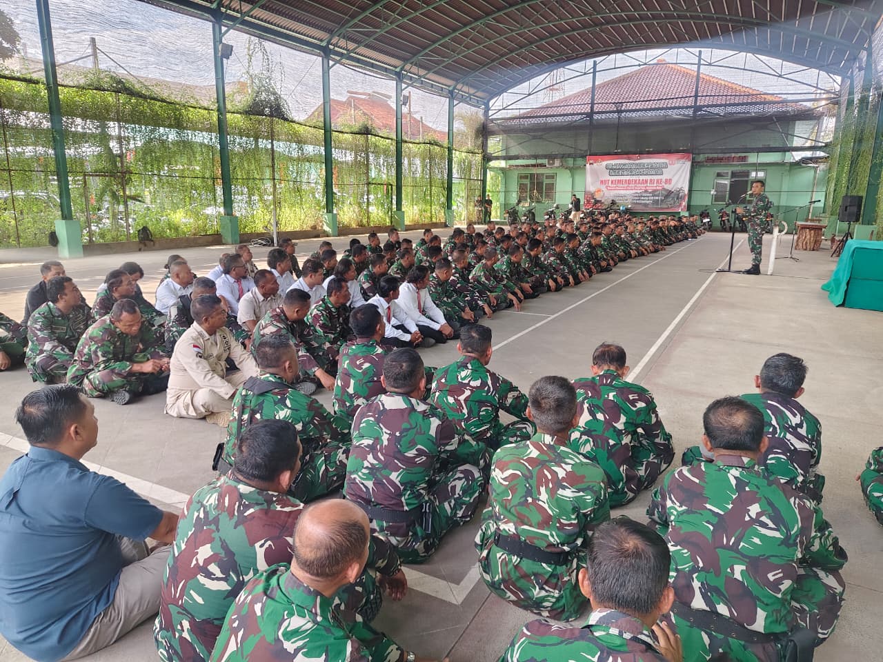 Brebes – Dandim 0713 /Brebes Letkol Inf Sapto Broto,S.E., M.Si memberikan pengarahan Jam Komandan dihadapan seluruh Parjurit dan PNS di Indoor Lapangan Tenis Makodim 0713/Brebes, Rabu (17/09/2025).