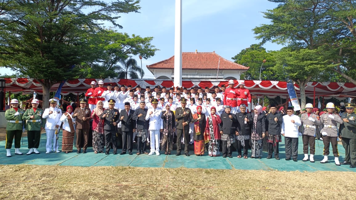 Brebes – Dandim 0713 Brebes, Korem 071 Wijayakusuma, Letkol Infanteri Sapto Broto, S.E., M.Si., bersama Forkopimda Brebes mengikuti upacara peringatan detik-detik Proklamasi Kemerdekaan Republik Indonesia ke 79 dan pengibaran sang merah putih yang dipimpin langsung oleh Pj. Bupati Brebes Iwanuddin Iskandar, S.H., M.Hum, bertempat di lapangan alun-alun Kabupaten Brebes. Sabtu (17/08/2024).