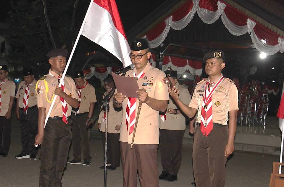 Brebes – Dandim 0713 Brebes Letkol Inf Sapto Broto, S.E., M.Si., pimpin upacara ulang janji dan renungan Hari Pramuka ke-63 Tingkat Daerah Brebes Tahun 2024. Selasa malam (13/08/2024).