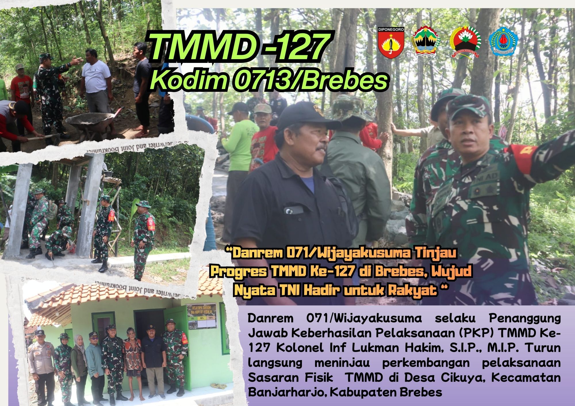 BREBES- Komitmen TNI dalam membangun desa kembali terlihat dalam kegiatan TNI Manunggal Membangun Desa (TMMD) Ke-127 Kodim 0713/Brebes. Danrem 071/Wijayakusuma selaku Penanggung Jawab Keberhasilan Pelaksanaan (PKP) Kolonel Inf Lukman Hakim, S.I.P., M.I.P. Turun langsung meninjau perkembangan pelaksanaan TMMD di Desa Cikuya, Kecamatan Banjarharjo, Kabupaten Brebes, Minggu (1/3/2026).