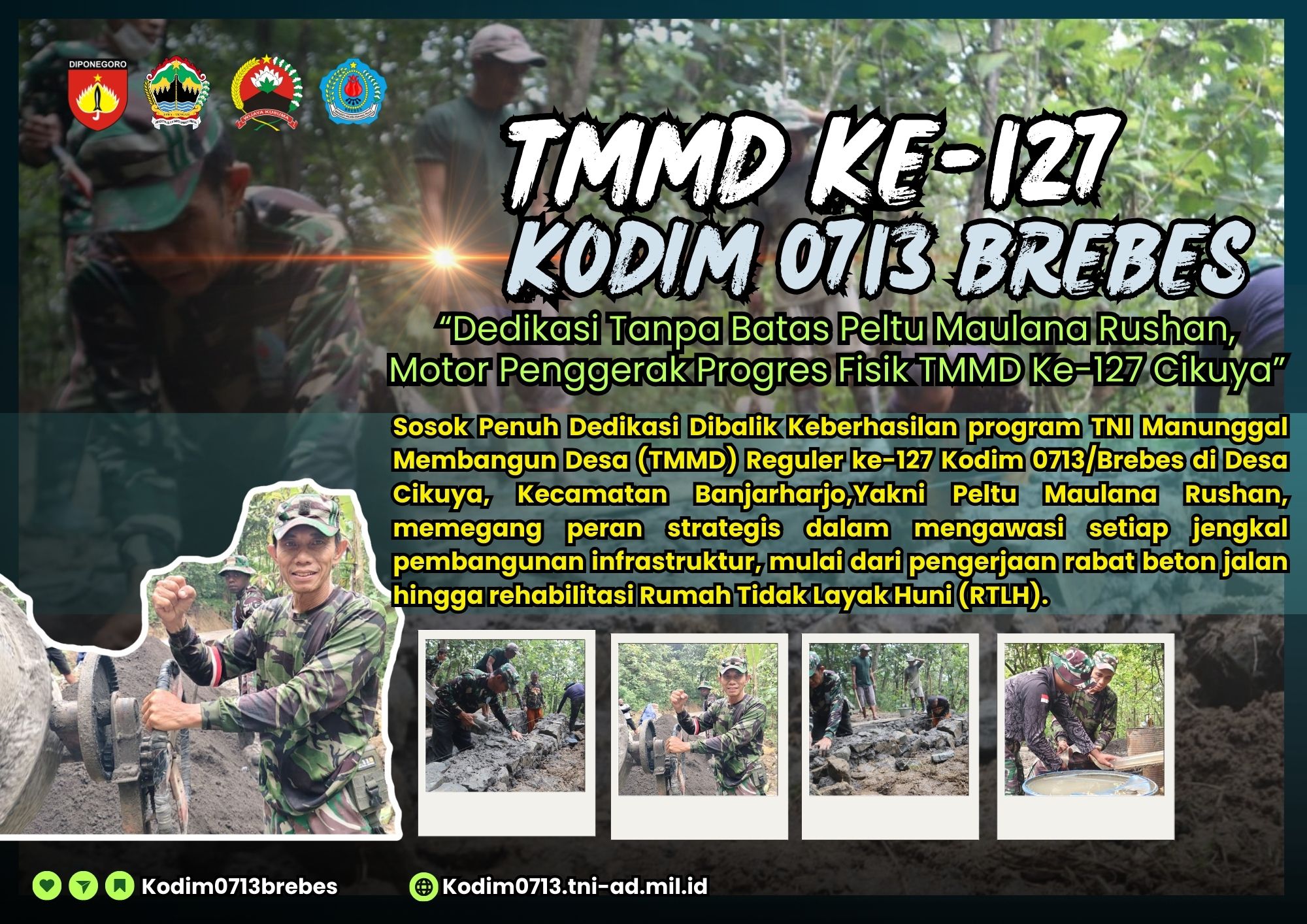 Brebes – Keberhasilan program TNI Manunggal Membangun Desa (TMMD) Reguler ke-127 Kodim 0713/Brebes di Desa Cikuya, Kecamatan Banjarharjo, tak lepas dari peran vital personel di lapangan. Salah satu sosok yang menjadi kunci kelancaran teknis dan penggerak semangat adalah Peltu Maulana Rushan.