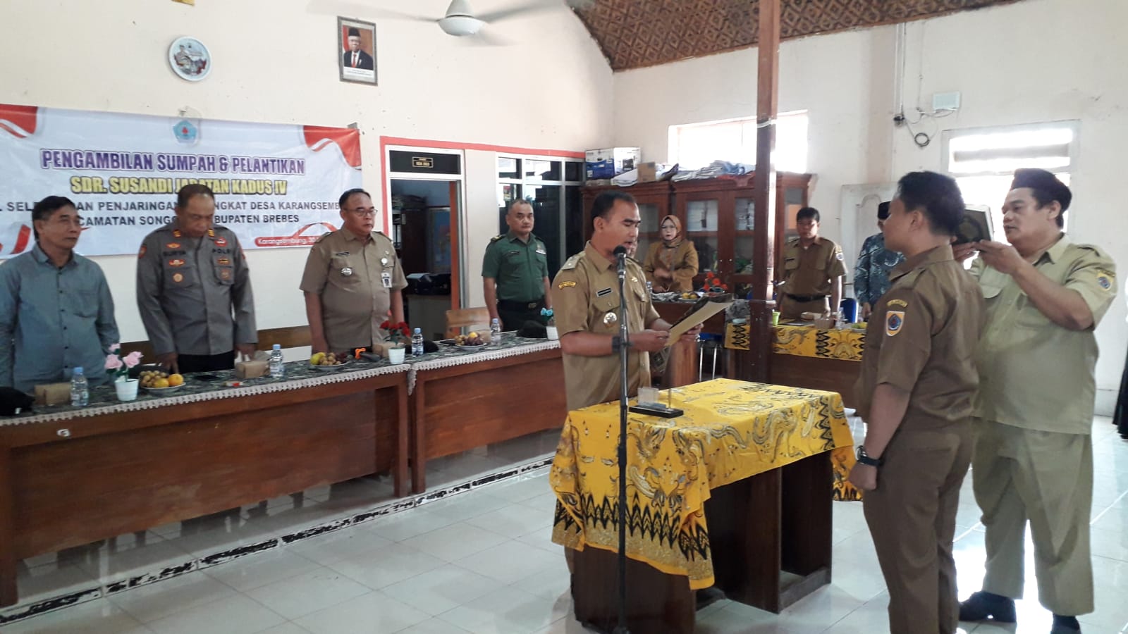 Brebes – Babinsa Koramil 17 Songgom, Kodim 0713 Brebes, Peltu Jenal Aripin menghadiri pelantikan dan pengambilan sumpah jabatan Kadus IV bertempat di Aula Kantor Desa Karangsembung, Kecamatan Songgom, Brebes, Jawa Tengah. Senin (30/09/2024).