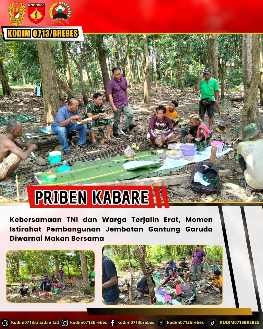 BREBES – Suasana penuh keakraban dan kebersamaan mewarnai proses pembangunan Jembatan Gantung Garuda di Desa Bangbayang, Kecamatan Bantarkawung, Kabupaten Brebes, Jawa Tengah. Pada Minggu (19/4/2026), di sela-sela kegiatan pembangunan, anggota Koramil 12/Bantarkawung bersama masyarakat memanfaatkan waktu istirahat dengan makan bersama di lokasi pekerjaan.