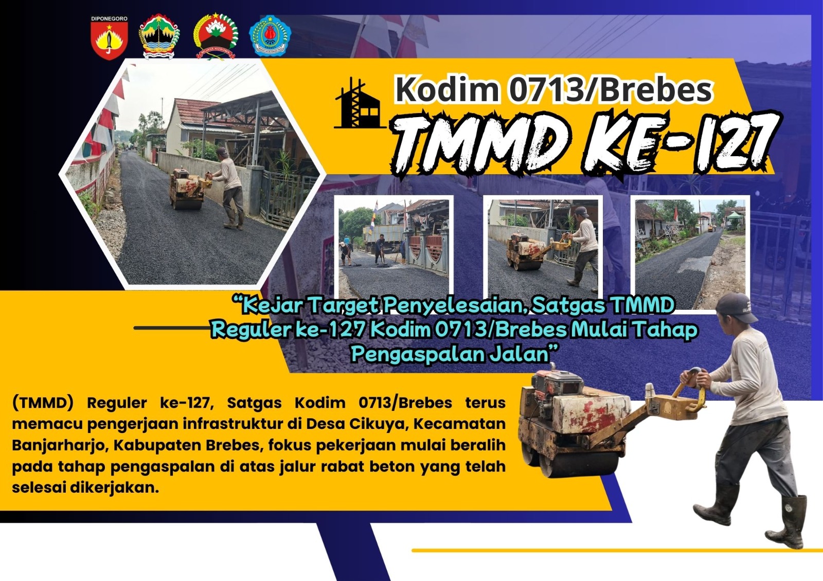 BREBES – Memasuki hari ke-21 pelaksanaan TNI Manunggal Membangun Desa (TMMD) Reguler ke-127, Satgas Kodim 0713/Brebes terus memacu pengerjaan infrastruktur di Desa Cikuya, Kecamatan Banjarharjo, Kabupaten Brebes. Pada Selasa (03/03/2026), fokus pekerjaan mulai beralih pada tahap pengaspalan di atas jalur rabat beton yang telah selesai dikerjakan.