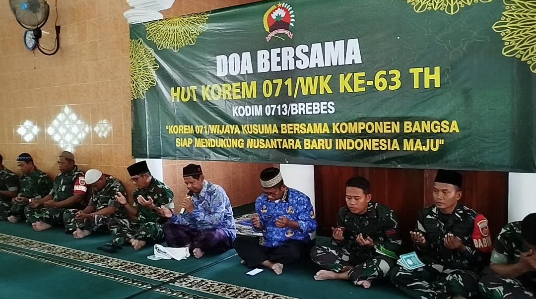 Brebes – Kodim 0713 Brebes menggelar doa bersama dalam rangka Hut Korem 071 Wijayakusuma ke-63 Tahun 2024 yang diikuti oleh anggota TNI dan PNS serta Persit Kartika Chandra Kirana Cabang XXIII Dim 0713 Koorcab Rem 071 PD IV/Diponegoro berlangsung di Masjid Darut Taqwa Jalan Jenderal Soedirman 107 Brebes, Jawa Tengah. Kamis (29/08/2024).