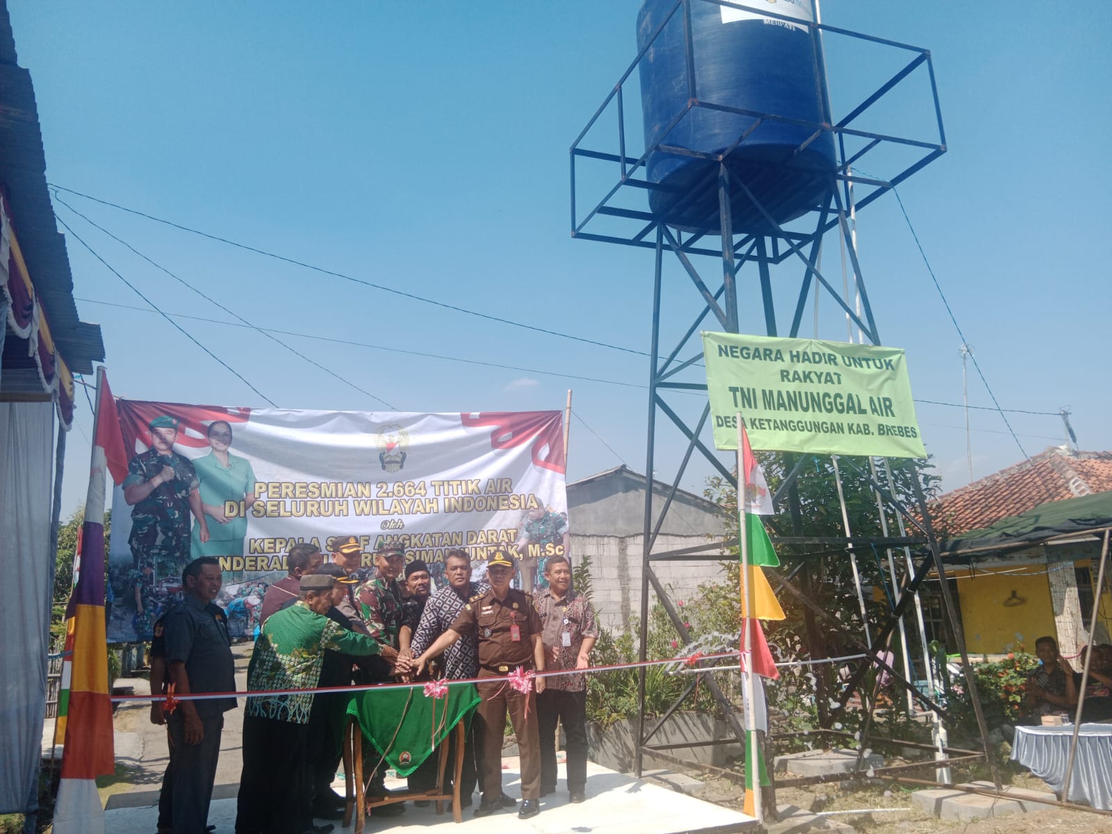 ” Kami Forkompinda, Muspika, Tokoh Agama dan Masyarakat serta warga secara Online di Dukuh Prapag RT 02 RW 03 Desa Ketanggungan dengan menekan tombol sirine tanda diresmikannya Sumber Air Bersih dan bisa digunakan oleh masyarakat di Brebes”. tambah Letkol Inf Sapto Broto, S.E., M. Si.