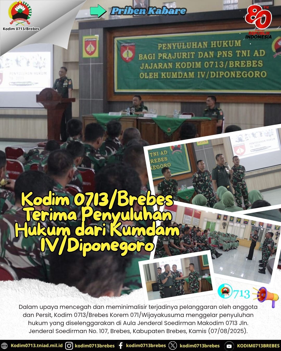 Brebes – Dalam upaya mencegah dan meminimalisir terjadinya pelanggaran oleh anggota dan Persit, Kodim 0713/Brebes Korem 071/Wijayakusuma menggelar penyuluhan hukum yang diselenggarakan di Aula Jenderal Soedirman Makodim 0713 Jln. Jenderal Soedirman No. 107, Brebes, Kabupaten Brebes, Kamis (07/08/2025).