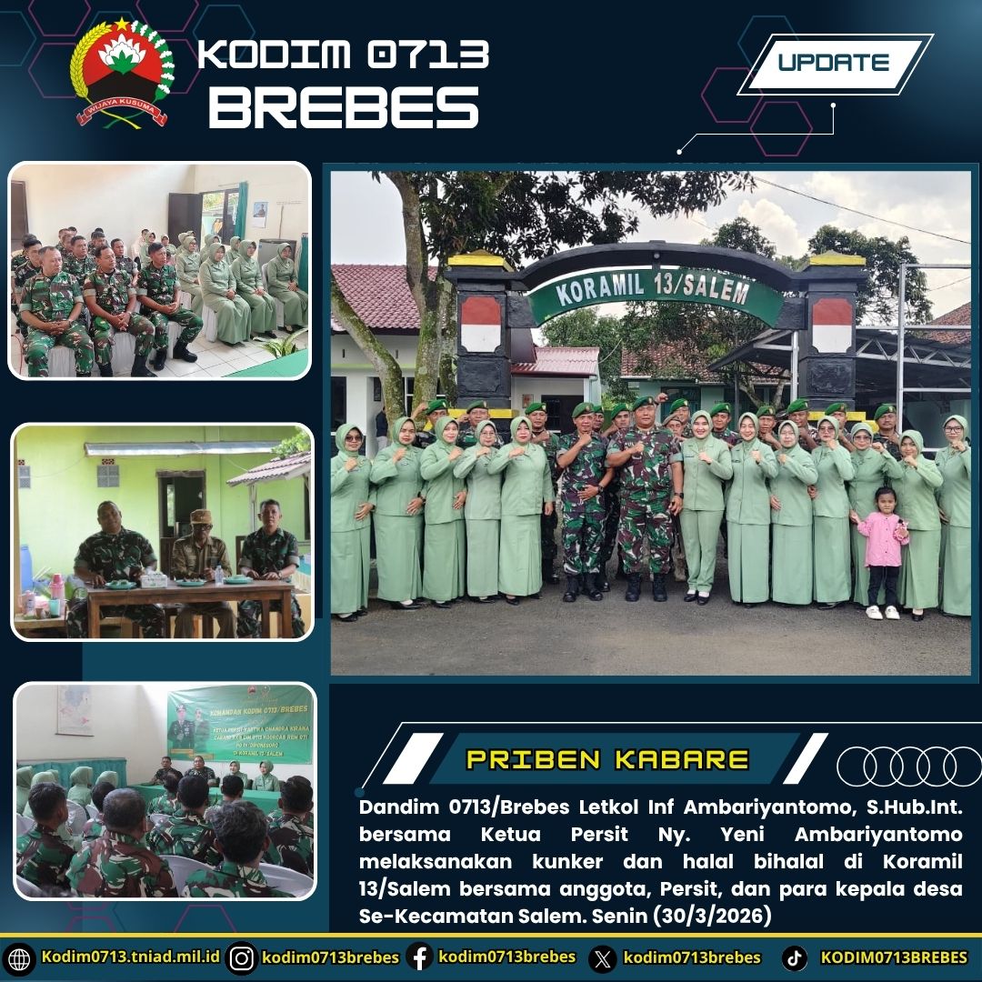 Brebes – Senin (30/3/2026), Komandan Kodim 0713/Brebes Letkol Inf Ambariyantomo, S.Hub.Int., bersama Ketua Persit Kartika Chandra Kirana Cabang XXIII Dim 0713 Koorcab Rem 071 PD IV/Diponegoro Ny. Yeni Ambariyantomo melaksanakan kunjungan kerja (kunker) yang dirangkaikan dengan kegiatan halal bihalal di Koramil 13/Salem.