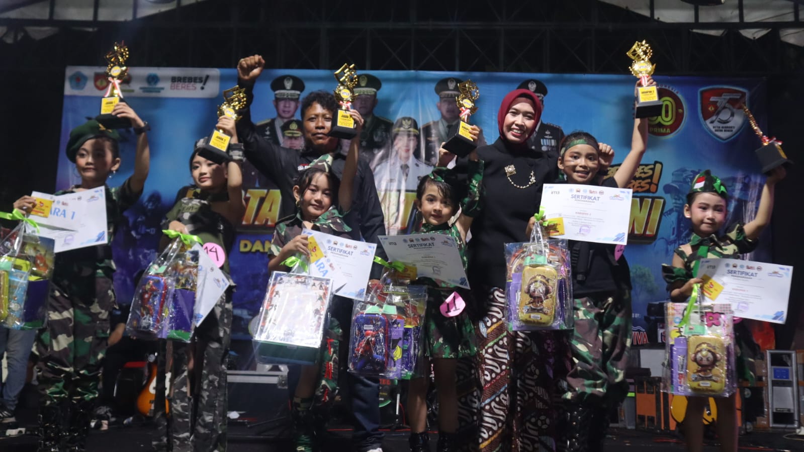 Hadir dalam malam penutupan Pesta Rakyat, Forkompinda Brebes dan Ketua Persit Kartika Chandra Kirana Cabang XXIII Dim 0713 Koorcab Rem 071 PD IV/Diponegoro Ny. dr. Novi Sapto, Sp.M. bersama pengurus menyerahkan piala dan tropy Lomba Fashion Show TNI. (Pen0713)