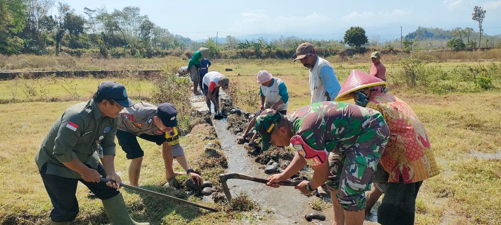 Brebes – TNI Kodim 0713 Brebes, Koramil 09 Tonjong bersama Polsek, Koopro PPL Kecamatan Tonjong dan PPL serta warga Desa Kutamendala kerja bakti bahu-membahu memperbaiki saluran irigasi yang terputus panjang kurang lebih 1.000 meter dengan lebar 0.5 meter di persawahan Bojong Cengis, Dukuh Gardu, Desa Kutamendala, Tonjong, Brebes, Jawa Tengah. Jum’at (13/09/2024).