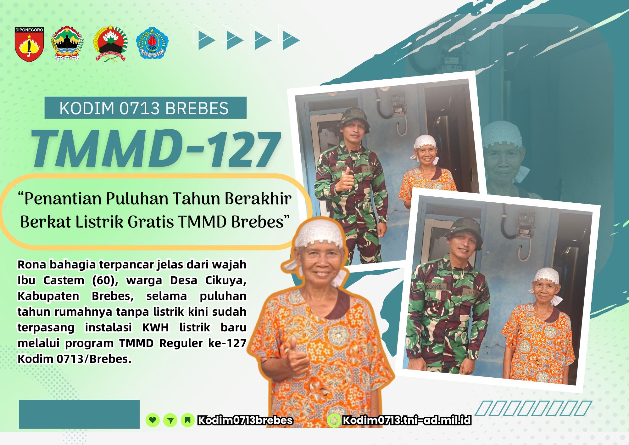 Namun, lewat sasaran non-fisik dan bantuan stimulan dalam program TMMD tahun ini, personel Satgas Kodim 0713/Brebes bergerak cepat melakukan pemasangan KWH meteran listrik khusus untuk rumahnya.
