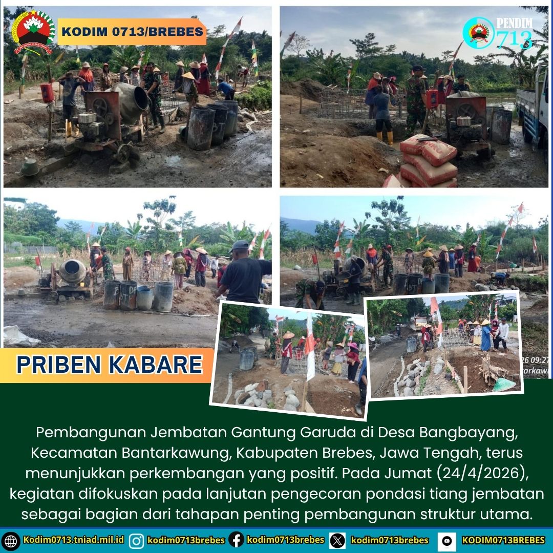 BREBES – Pembangunan Jembatan Gantung Garuda di Desa Bangbayang, Kecamatan Bantarkawung, Kabupaten Brebes, Jawa Tengah, terus menunjukkan perkembangan yang positif. Pada Jumat (24/4/2026), kegiatan difokuskan pada lanjutan pengecoran pondasi tiang jembatan sebagai bagian dari tahapan penting pembangunan struktur utama.