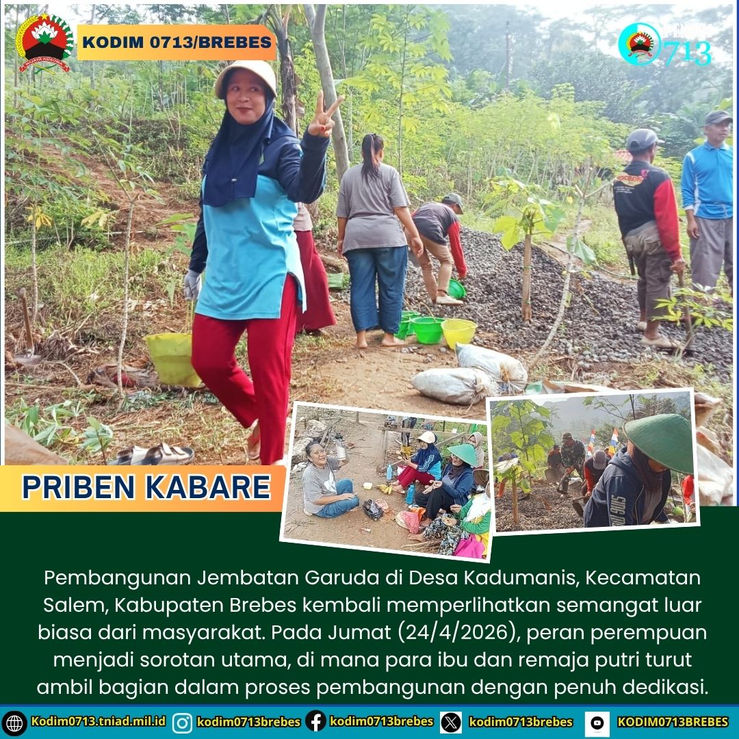 BREBES – Pembangunan Jembatan Garuda di Desa Kadumanis, Kecamatan Salem, Kabupaten Brebes kembali memperlihatkan semangat luar biasa dari masyarakat. Pada Jumat (24/4/2026), peran perempuan menjadi sorotan utama, di mana para ibu dan remaja putri turut ambil bagian dalam proses pembangunan dengan penuh dedikasi.