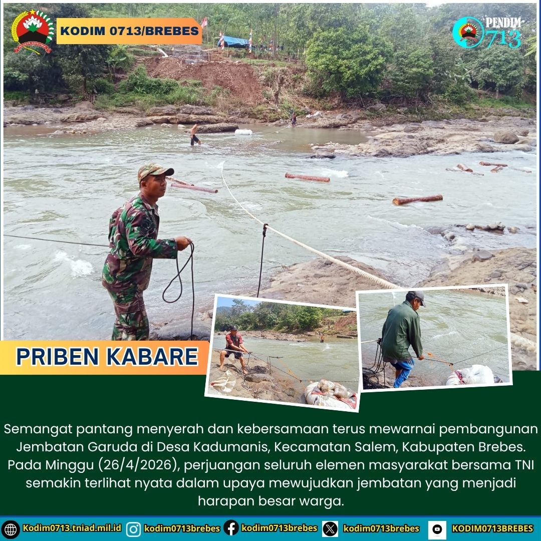 BREBES – Semangat pantang menyerah dan kebersamaan terus mewarnai pembangunan Jembatan Garuda di Desa Kadumanis, Kecamatan Salem, Kabupaten Brebes. Pada Minggu (26/4/2026), perjuangan seluruh elemen masyarakat bersama TNI semakin terlihat nyata dalam upaya mewujudkan jembatan yang menjadi harapan besar warga.