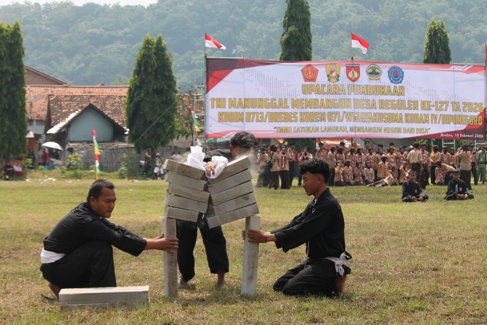 BREBES- Pembukaan TNI Manunggal Membangun Desa (TMMD) ke-127 berlangsung semarak dengan kehadiran Persaudaraan Setia Hati Terate (PSHT) Ranting Banjarharjo yang turut ambil bagian dalam rangkaian acara. Penampilan atraksi dan partisipasi warga PSH menambah semangat kebersamaan serta memperkuat nilai persatuan dalam kegiatan tersebut. Selasa(10/2/2026)