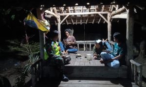 Salah satu anggota Satgas TMMD, Koptu Hendra, tampak hadir dan ikut serta melaksanakan kegiatan Ronda Malam (Pos Kamling) bersama warga Desa Cikuya, Kecamatan Banjarharjo, Kabupaten Brebes.