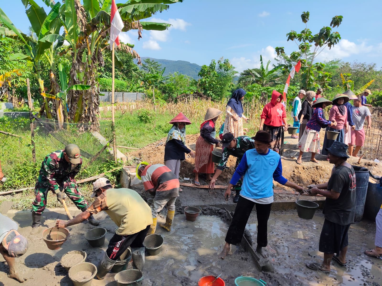 Dalam kegiatan pengecoran, para ibu bersama anggota Koramil 12/Bantarkawung dan warga lainnya bekerja secara estafet menggunakan ember untuk mengangkut adukan cor menuju titik pondasi. Dengan penuh semangat, mereka saling bergantian mengoper ember, menciptakan alur kerja yang efektif meski dengan peralatan sederhana.