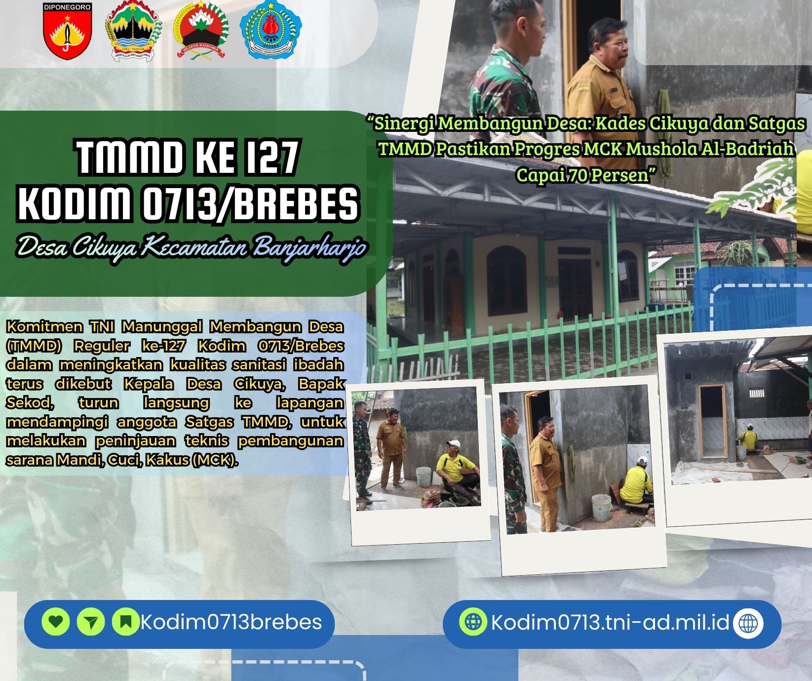 Peninjauan ini difokuskan pada titik pembangunan di Mushola Al-Badriah yang berlokasi di Dukuh Kopi, Desa Cikuya. Proyek ini merupakan salah satu program unggulan non-fisik dan fisik yang terintegrasi dalam skema TMMD Reguler ke-127, bertujuan untuk memberikan kenyamanan bagi jamaah serta masyarakat sekitar dalam menjalankan aktivitas ibadah dan menjaga kebersihan lingkungan.