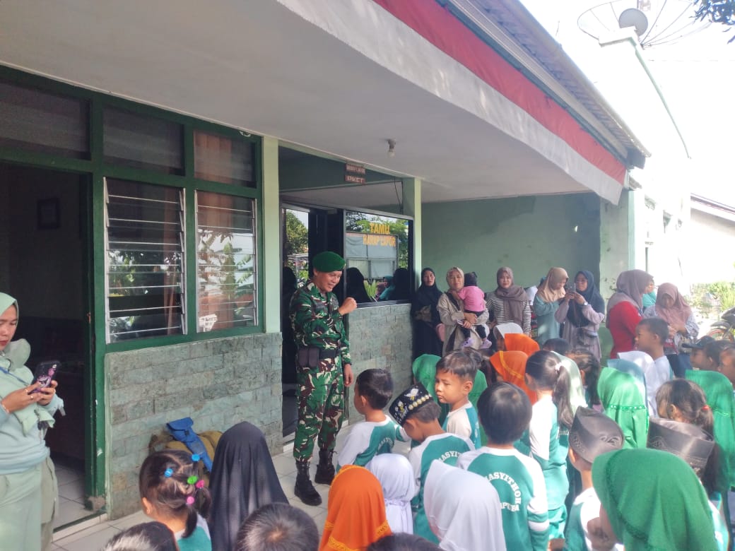 Bati Tuud Koramil 09/Tonjong Peltu Ibrohim menyambut hangat rombongan. Anak-anak diberikan wawasan tentang tugas dan peran TNI dalam menjaga keutuhan negara.