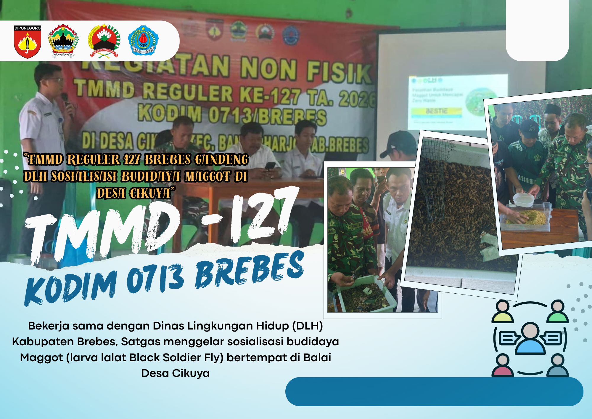 Brebes – Satuan Tugas (Satgas) TMMD Reguler ke-127 Kodim 0713/Brebes terus memacu realisasi program non-fisik bagi masyarakat. Bekerja sama dengan Dinas Lingkungan Hidup (DLH) Kabupaten Brebes, Satgas menggelar sosialisasi budidaya Maggot (larva lalat Black Soldier Fly) bertempat di Balai Desa Cikuya, Jum’at (27/02/2026).