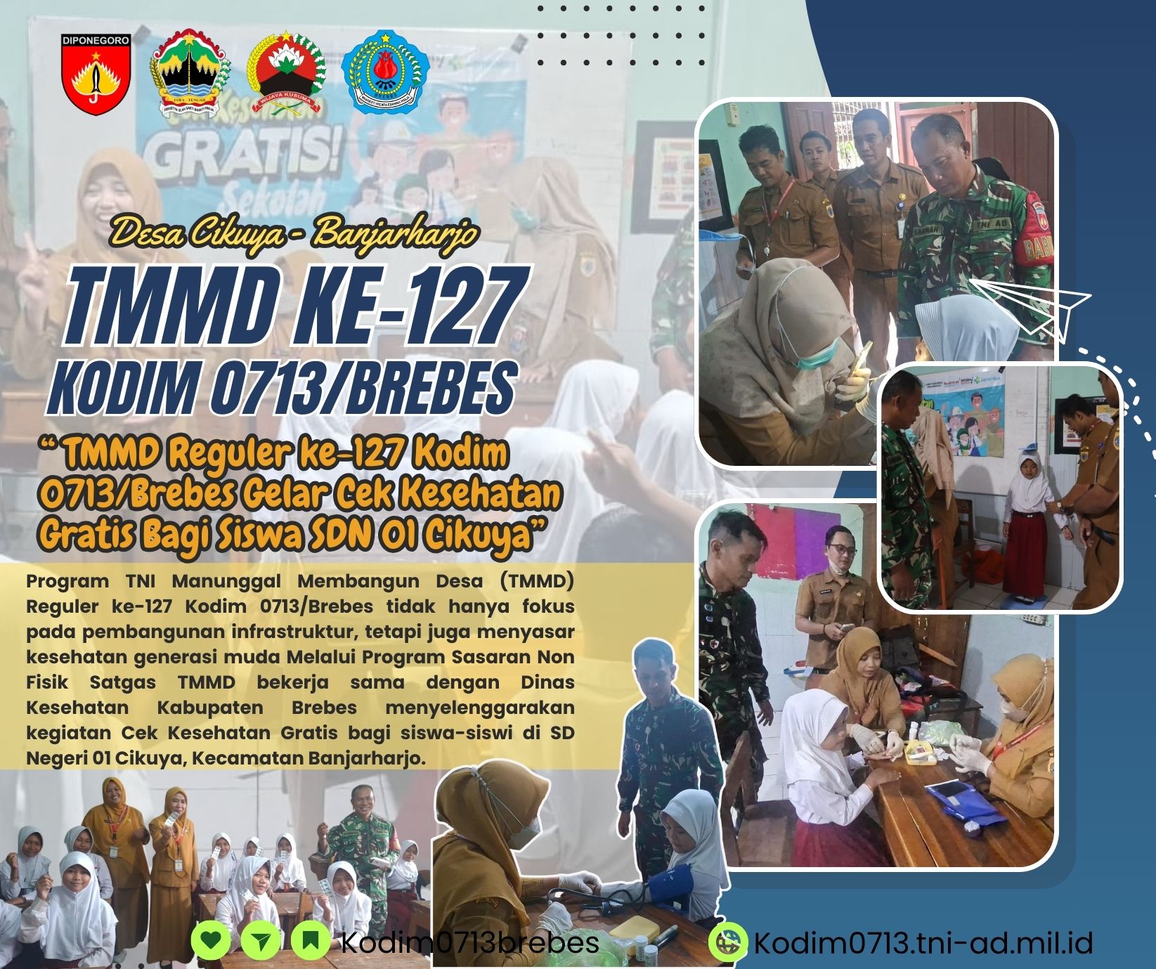 BREBES – Program TNI Manunggal Membangun Desa (TMMD) Reguler ke-127 Kodim 0713/Brebes tidak hanya fokus pada pembangunan infrastruktur, tetapi juga menyasar kesehatan generasi muda. Pada Rabu (25/02/2026), Satgas TMMD bekerja sama dengan Dinas Kesehatan Kabupaten Brebes menyelenggarakan kegiatan Cek Kesehatan Gratis bagi siswa-siswi di SD Negeri 01 Cikuya, Kecamatan Banjarharjo.