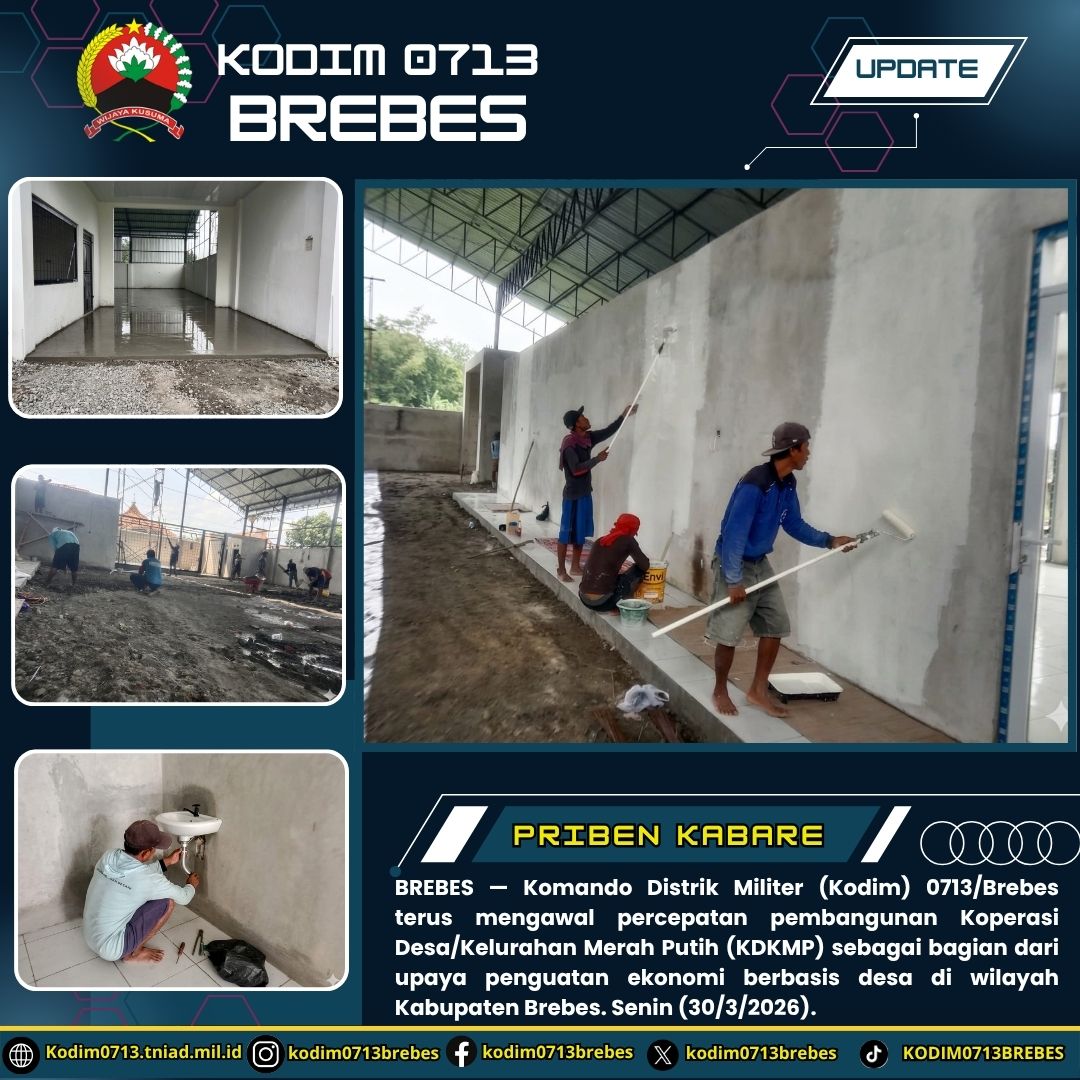 BREBES — Komando Distrik Militer (Kodim) 0713/Brebes terus mengawal percepatan pembangunan Koperasi Desa/Kelurahan Merah Putih (KDKMP) sebagai bagian dari upaya penguatan ekonomi berbasis desa di wilayah Kabupaten Brebes. Kegiatan tersebut dilaksanakan pada Senin (30/3/2026).