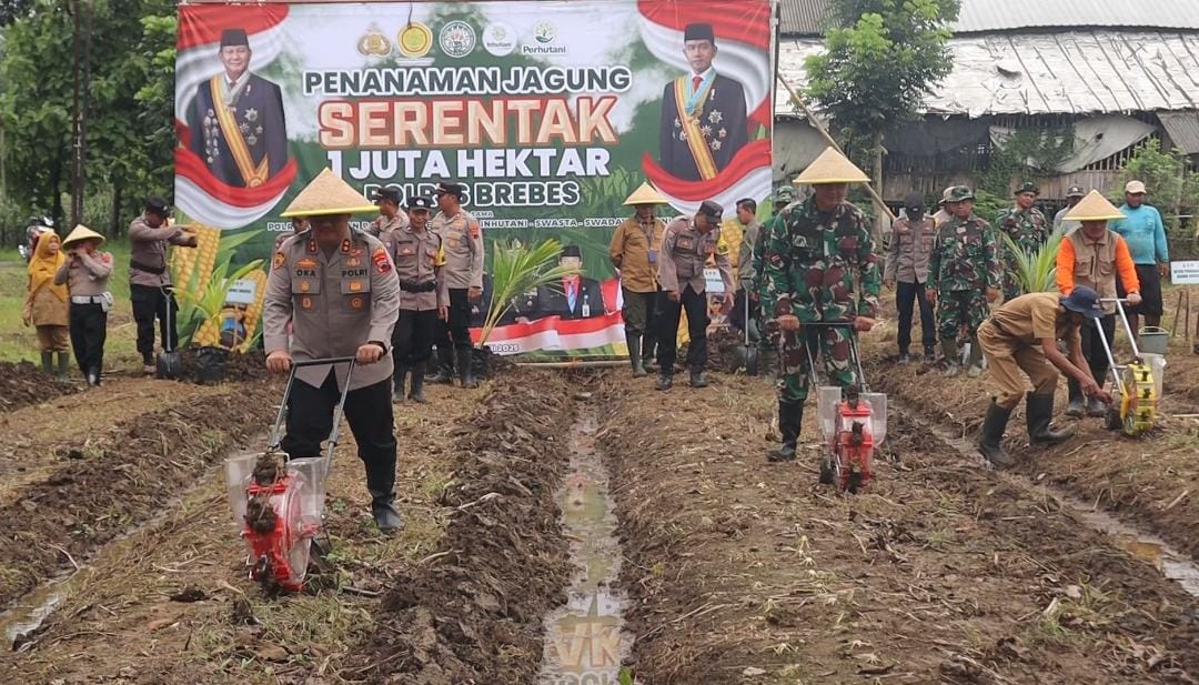 BREBES– Polres Brebes bersama sejumlah pihak menggelar program penanaman jagung 1 juta hektar serentak di Indonesia. Di Kabupaten Brebes, acara ini dilaksanakan di Desa Malahayu Kecamatan Banjarharjo dan Desa Tonjong Kecamatan Tonjong. Selasa (21/1/2025). Selain jagung, tanaman kelapa juga ditanam di lahan tidur atau lahan tidak produktif sebagai bagian dari upaya mendukung ketahanan pangan nasional.
