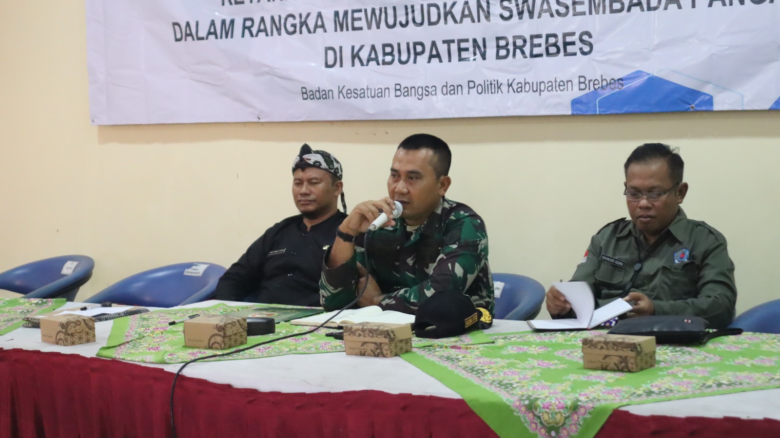 Hadir dalam acara tersebut Komandan Kodim 0713/Brebes Letkol Inf Sapto Broto,S.E.,M.Si., Kepala Bakesbangpol Kabupaten Brebes Moch Sodiq, S.STP, MSi beserta staf dan 100 orang anggota Babinsa Kodim 0713/Brebes sebagai peserta rapat.
